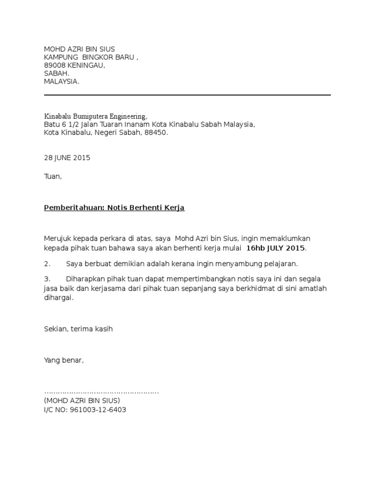 Koleksi contoh surat berhenti kerja dalam bahasa melayu dan bahasa inggeris. 8 contoh surat pengunduran diri resmi formal singkat baik sopan. Namun dikarenakan satu dan lain hal, suatu perusahaan bisa saja memberhentikan karyawan mereka dari pekerjaan. Merujuk kepada perkara di atas, saya ahmad farhan bin ahmad fuad, ingin memaklumkan kepada pihak tuan bahawa saya akan berhenti kerja mulai 31hb may 2010. Iaitu tentang kebarangkalian anda juga boleh untuk terus bekerja dengan majikan lama dengan gaji yang lebih tinggi. Berhenti kerja samaada untuk berpindah ke tempat kerja yang lebih baik, atau pun berhenti untuk memulakan bisnes sememangnya menjadi idaman semua orang. Berikut contoh surat pengunduran diri yang dapat anda jadikan refrensi. Antaranya ialah format surat berhenti kerja 24 jam, berhenti serta merta dan yang paling biasa, dengan notis sebulan. Use the download button below or simple online reader. Jika anda bekerja di sebuah perusahaan, maka anda akan memiliki tanggung jawab pekerjaan yang diberikan oleh atasan anda. Pada 6 juni 2018 saya selaku guru di paud/tk* tunas bangsa mengajukan permohonan untuk mengundurkan diri (sebulan setelah surat ini di keluarkan) dikarenakan harus dirawat karena. Nyatakan sebab kenapa anda perlu berhenti kerja pada bulan hadapan dan jadikan ianya sesuatu yang positif. Surat ni aku create time nk berhenti kerja kilang wong engineering.